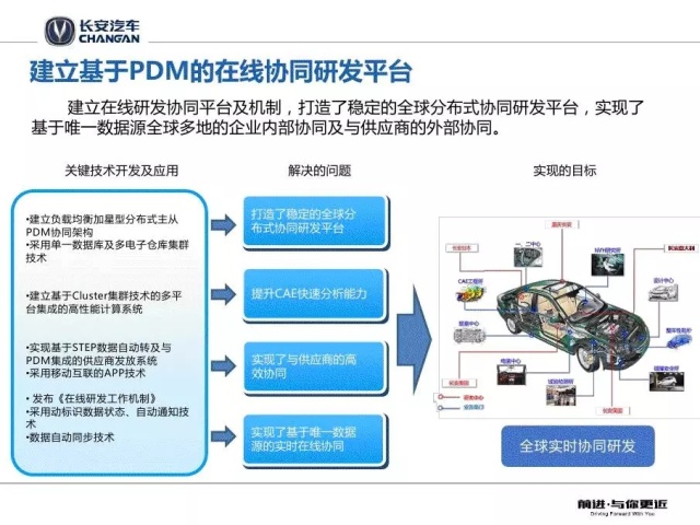 2011年是长安最忙碌的一年,因为2010年汽车井喷,我们也发现公司内部确实有很多需要改进的地方,其中之一就是产品开发,如何建立在线研发协同平台及机制?通常长安的汽车是在意大利完成整个造型与整车布置,在英国做发动机,在日本做内饰,在美国做底盘和智能驾驶,在国内主要做集成,这样一个开发体系如何保证所有的数据是在线的,而且可以全球24小时协同开发?在2011年,长安开始推广在线研发协同平台,将全部产品在2013年3月31日全部实现在线,全部按PDS开发流程在线的,从而确保整个产品数据的唯一性。