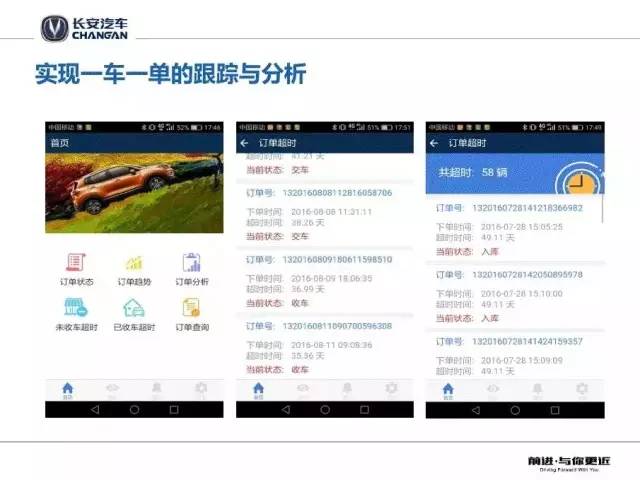 实际上长安在推个性化定制的同时,还推出了手机移动端的APP,实现一车一单的跟踪。消费者,经销商,销售公司的管理人员通过这给APP可以直接看到订单的状态、订单的分析、车辆的状态、生产的状态等,有些没有按照订单交付的在哪一状态,在交车状态还是收车状态?另外超时的原因是入库了还是其他都可以通过这个APP来判断。