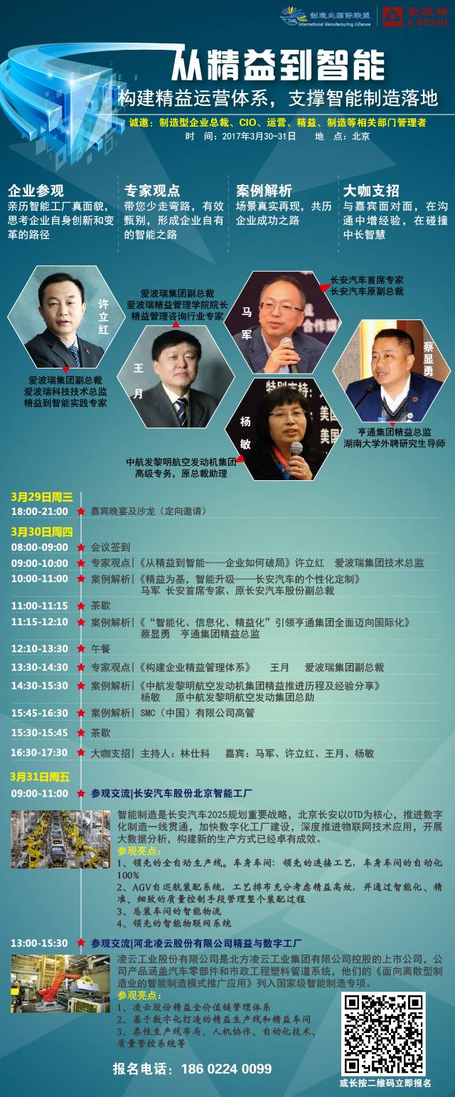 本月30-31日,在智能峰会北京站上,长安汽车首席专家、原副总裁马军,将分享长安汽车的个性化定制之路。听长安领航人现场讲授经验和方法,企业家和相关部门负责人一定不能错过。峰会第二天,将带领参会者到长安北京智能工厂实地参观考察,现场感受长安领先的全自动生产线、AGV自巡航装配系统、总装车间的智能物流等。