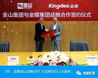 金蝶积极谋求“互联网+”的创新发展,与金山、亚马逊、京东、等互联网巨头在云服务领域展开积极的全面合作。4月,金蝶设立长沙移动互联网基地、并于五四青年节成立四家移动互联网公司,加速互联网+布局。12月,携手京东、航信实现全国首例电子发票入账,带动财税领域的新一轮变革。同月发布“账无忧”企业财税服务平台,让小微企业财税一键无忧。