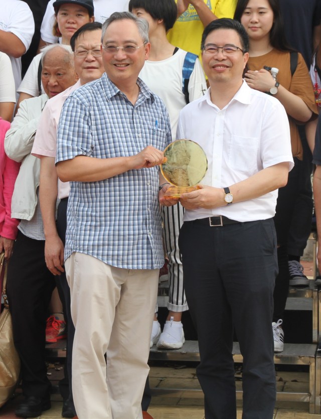 顺德区工商联主席、万和电气董事长叶远璋代表万和电气接受香港九龙总商会赠送的纪念品