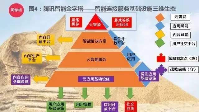 腾讯的智能金字塔,信息通讯、应用赋能、内容赋能、社交平台四个维度,都有清晰的战略制高点和战略底线。