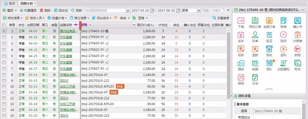 1、团期计划点击线路查看线路详情,可以查看线路行程和团期行程,以及提供行程文档下载功能;