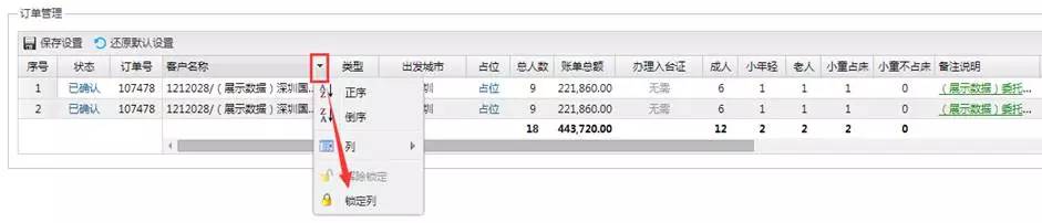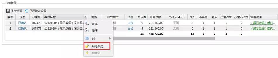1、锁定和解锁操作:在团期计划和订单管理表格默认会有两个区域,前面区域为“锁定区域”,后面区域为“正常区域”。当拖动滚动条的时候,锁定区域是不随滚动条的位置变化而变化的,始终保持在前面,方便我们查看;而正常区域会随滚动条移动而变化。列的锁定与解锁操作如下: