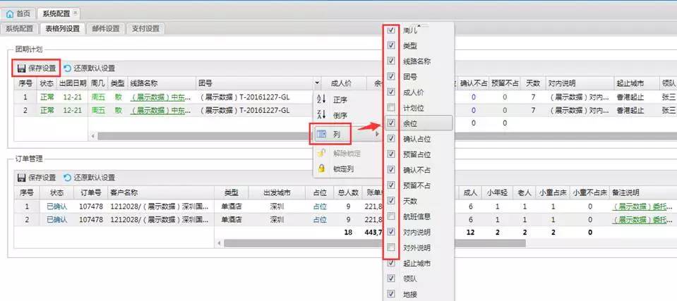 2、显示和隐藏列:在两个区域的表头处,在任意列点击向下按钮,显示快捷菜单,在“列”项,可以自行勾选要显示哪些内容,如不勾选在团期计划和订单管理两个模块将不会显示出来。