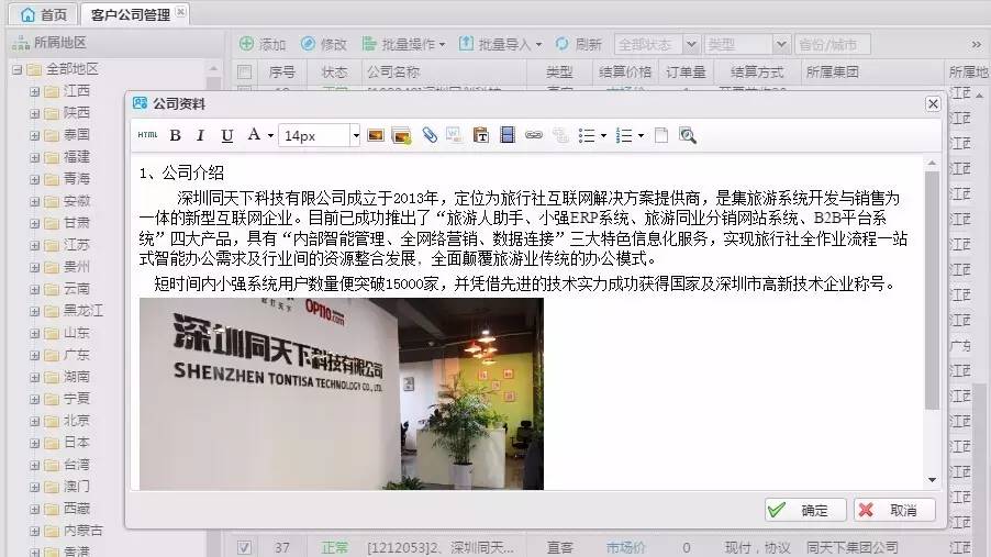 由于对接的组团社太多,销售对每个客户公司详情并不是都清楚了解,有时甚至联系了信誉不佳的客户再次合作。为了杜绝该情况,现在,公司管理者可以先把客户公司的相关介绍录入系统供所有销售查看,比如和该客户公司签约了哪些合同、信用情况、服务质量、荣誉资质、环境照片等。如下图所示: