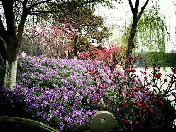 “凭君莫厌临风看,占断春光是此花”,春天注定是属于桃花的,圩墩公园桃花纷纷开放。目前,粉红山碧桃开花两成,位于桃源仙境入口处;白花山碧桃开花三成,位于湿地花溪绿地;就连粉花山碧桃也露出了花瓣。圩墩公园湿地花溪河岸边近1800平方米的二月兰也如火如荼开放,蓝紫色的小花显得朴实而清丽。二月兰因其农历二月前后开蓝紫色花而得名,又传说诸葛亮率军出征时曾采嫩梢为菜,所以也叫诸葛菜。