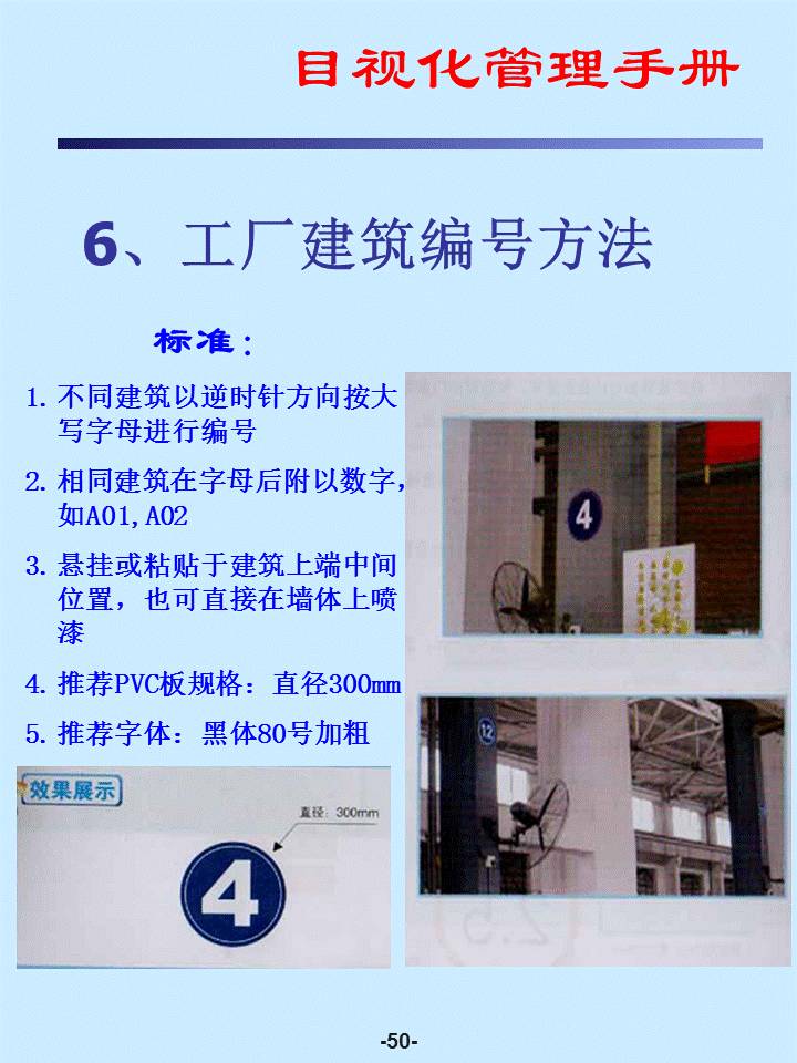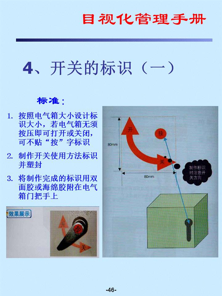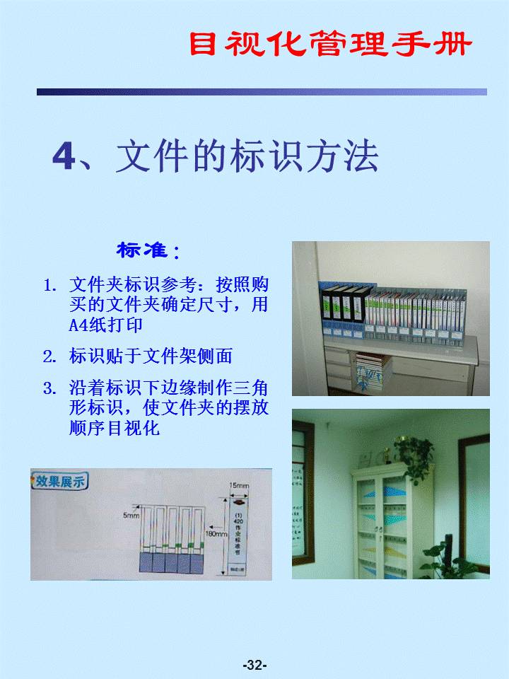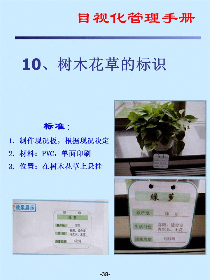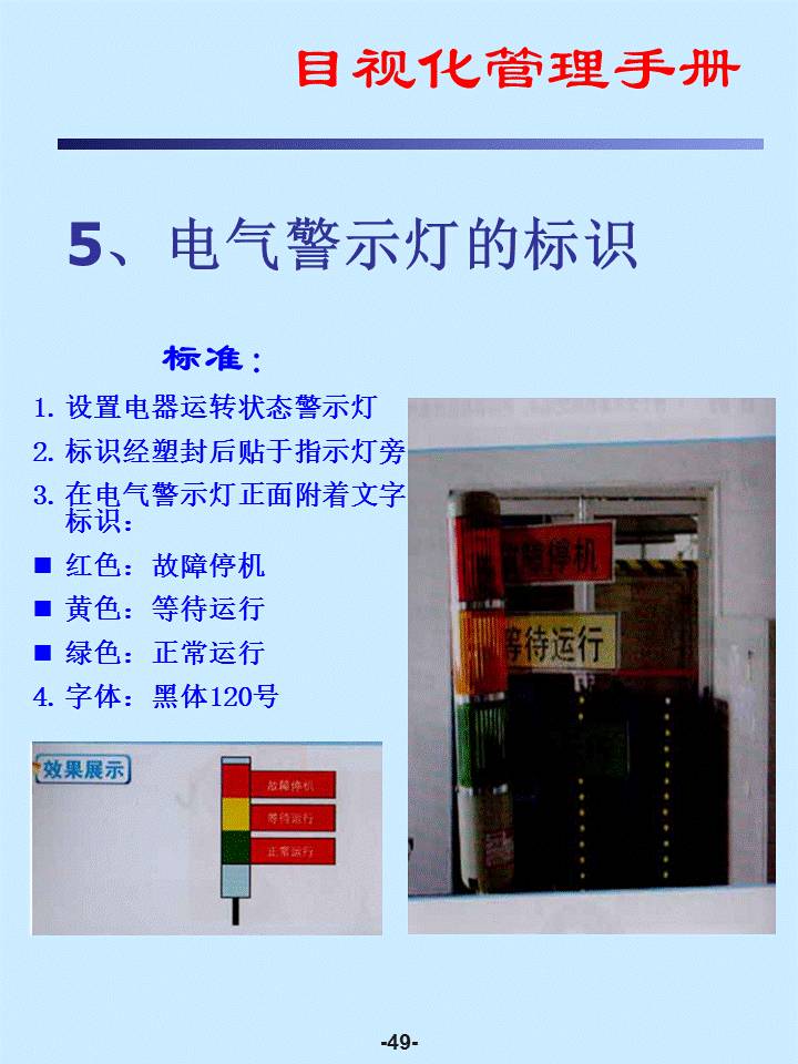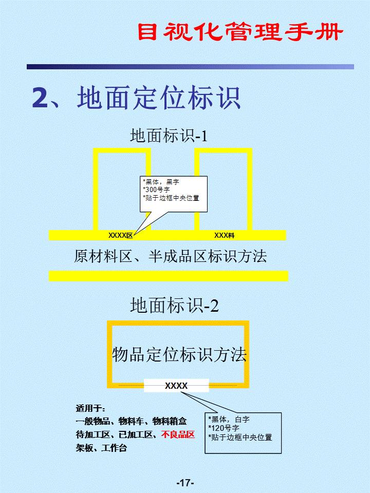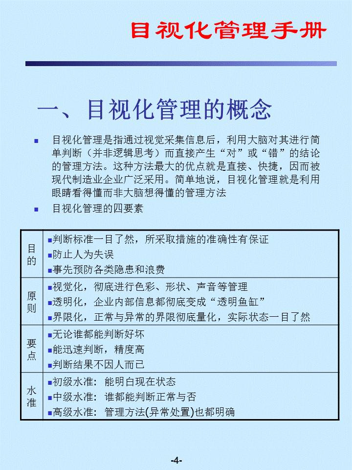 目视化管理是利用形象直观而又色彩适宜的各种视觉感知信息来组织现场生产活动,达到提高劳动生产率的一种管理手段!本PPT资料非常全面系统生动,值得各企业认真学习,打牢基础。