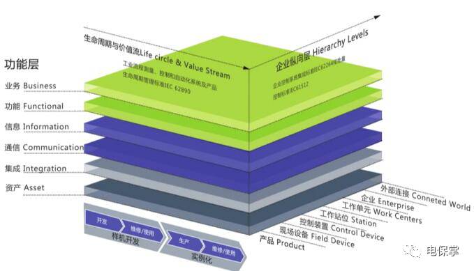 纵轴( IT 功能)上的各个层面从信息技术角度描述不同的视角,如:业务流程、功能描 述、数据映像、通信行为、硬件和设备等。横轴(生命周期和价值流)展现的是包括价值链 在内的产品生命周期维度。第三轴(企业纵向层)呈现的是工厂或设备内部功能和职责。
