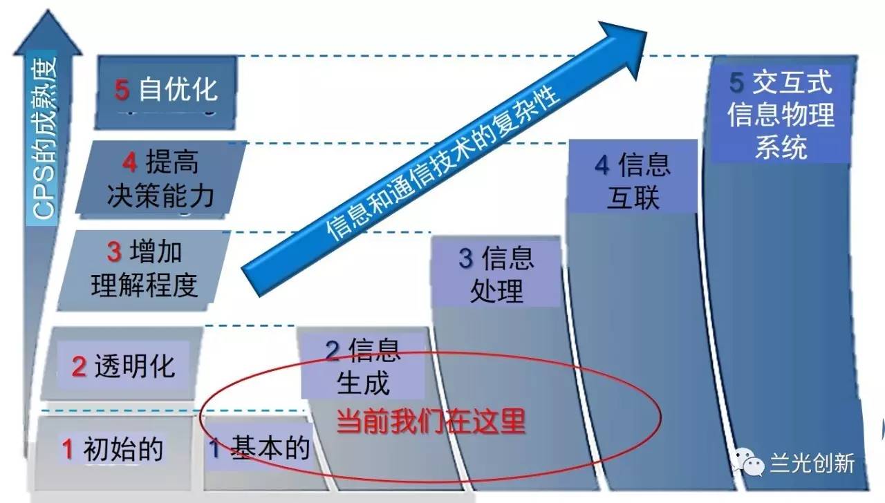 CPS应用领域遍及农业、楼宇、能源、制造、交通运输等,不仅仅局限于制造业,交互是CPS最主要的特征。当前CPS正处于快速发展的阶段,其成熟度与信息和通信技术的复杂性有关,成熟度分为5级:①初始的CPS,②透明化,③增加理解程度,④提高决策能力,⑤自优化。信息和通信技术的复杂性也分为5级:①基本的,②信息生成,③信息处理,④信息互联,⑤交互式信息物理系统。应该指出,到目前为止还没有能够实现自决策、自优化的交互系统,如图3所示。