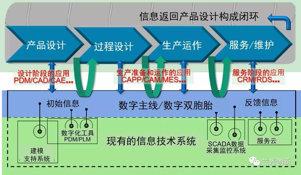 数字主线和数字双胞胎概念是美国空军2013年《全球科技愿景报告》中提出的。数字主线(Digital Thread)是借助建模仿真工具构建的、贯穿产品全生命周期,从材料、设计、工艺、制造到使用维护、并以统一模型为核心驱动的数据流和信息流。传统的数字化制造数据是由产品模型向数字化生产的单向传递,不同环节之间并未有效集成。如产品设计与工艺之间、数字化测量检验与产品定义之间都存在断点,各自使用不同的模型描述,缺乏有效集成和反馈。数字主线是所有连接的数据流以及物理资产的数据在整个生命周期中跨越传统孤立功能的集成化视图,采用标准和开放的描述,可以逐级向下传递而不失真,也可以回溯,具有访问、集成、转换和分析来自不同系统的数据和信息,使其在整个产品生命周期中成为可操作、可共享的资源。