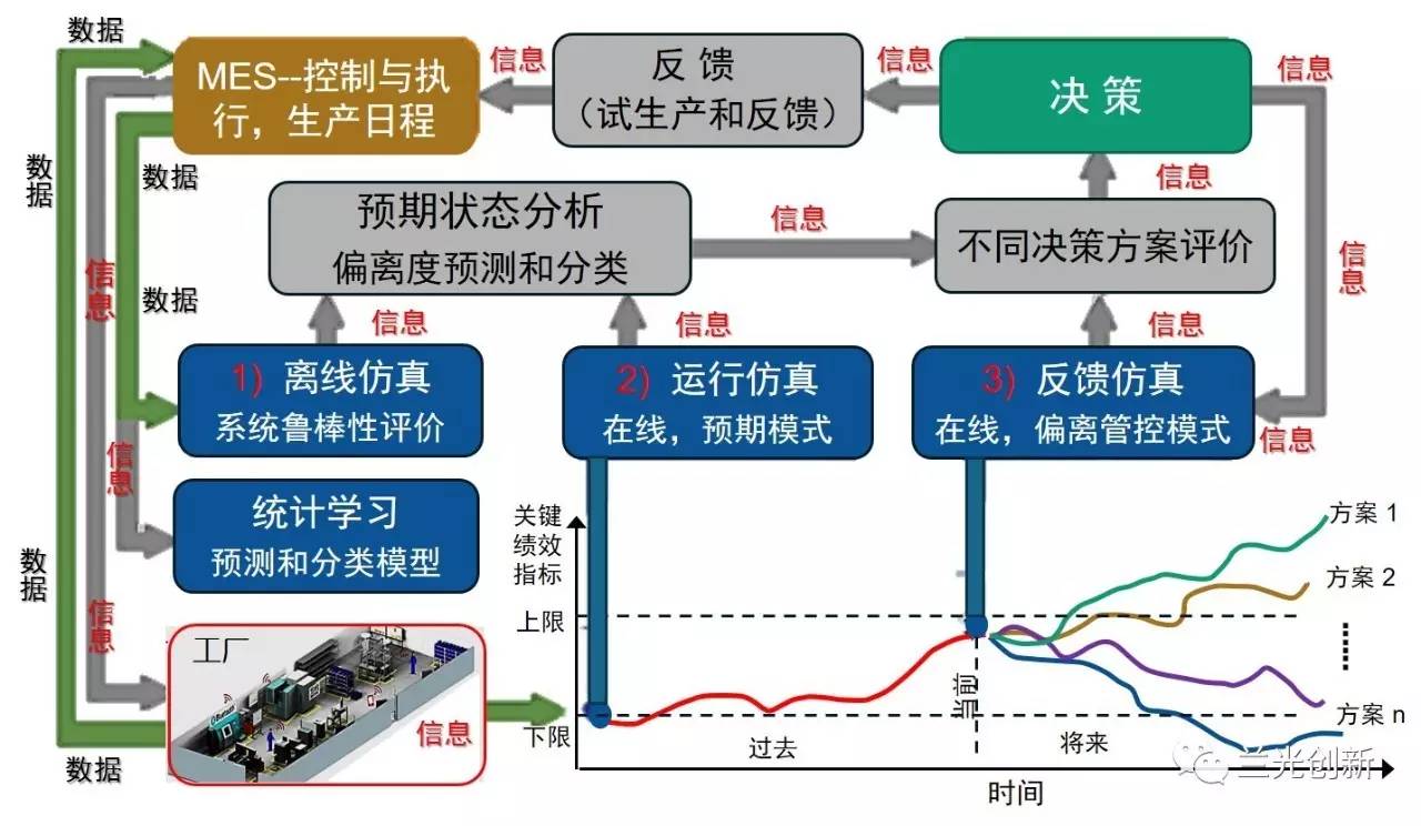 从图中可见,数字化工厂运行仿真可分为个阶段: ①离线评价,分析排产计划对执行过程突发事件的抗拒力(鲁棒性)。②在线, 近期排产的仿真,用于预先发现与计划排产的偏离度。③当已经发生偏离后,在线分析可采取的行动,如何使损失最小化(反馈仿真)。通过不同的仿真,可预测工厂运作的关键绩效指标(KPI),使工厂保持在KPI上下限之间运行,并且根据过去数据的分析提出未来的不同运作方案。
