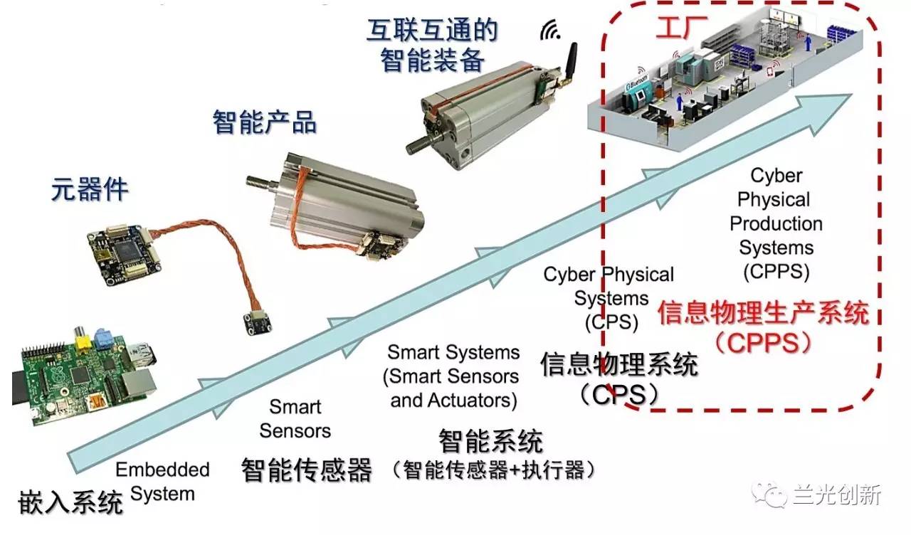 CPS的发展是从嵌入系统开始的,最初把计算机芯片嵌入各种机械、电器装置,以提高其性能,进一步与传感器连接,使其具有数据采集功能,成为智能传感器,智能传感器与执行器集成后,数据就可以控制装置的运作,成为智能系统或产品(如智能空调);当智能系统具有通信功能,可以互联互通,同时有数字模型可以仿真,就成为信息物理系统,把CPS应用于生产制造领域就称为信息物理生产系统,如图4所示。