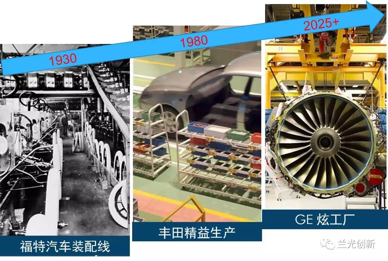 GE炫工厂的愿景是成为继福特装配自动线(分工+流水作业)和丰田精益生产(消灭浪费)之后的制造新理念和新模式(数字主线+自我完善)。工业革命以来三次模式的变迁如图12所示。