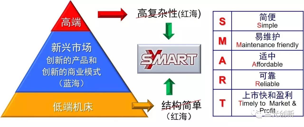 i5智能机床对“智能(SMART)”一词;有其独到的战略涵义。沈阳机床是我国机床行业的领头羊,万人大厂。沈阳机床的智能化是要打破机械制造和信息技术的行业边界,跨越物理世界和虚拟世界的篱笆,利用互联网平台整合社会资源,为客户提供智能化制造的解决方案,通过创新的产品和创新的商业模式,摆脱高端机床技术密集和低端机床价格大战的红海而驶向蓝海,如图15所示。