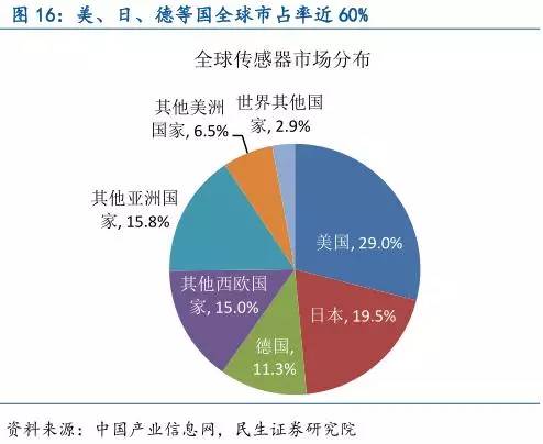 我国传感器有赖进口,技术差距仍明显。目前全球约有40个国家从事传感器研制、生产和应用开发,其中美、日、德等国的市场总占有率近60%,如德国海德汉、英国雷尼绍。相比下,我国传感器企业95%以上属小型企业,传感器技术水平偏低、研发实力较弱、规模偏小、产业集中度低。