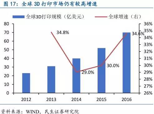 3D打印市场规模保持高速增长。Gartner发布的数据显示,2016年全球3D打印市场规模为70亿美元,至2020年将达到212亿,未来五年复合增速为32%。尽管增长显著,但事实上3D仅占到全球制造业市场的0.04%,市场潜力还未完全开发。
