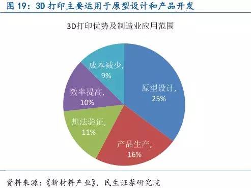 医疗器械行业作为第3大3D打印市场,需求量正在迅速增长,使用3D打印技术大批量定制产品,如人体助听器等。目前,3D打印在制造业适用方面主要有:原型设计(25%)、产品开发(16%)、想法验证(11%)。