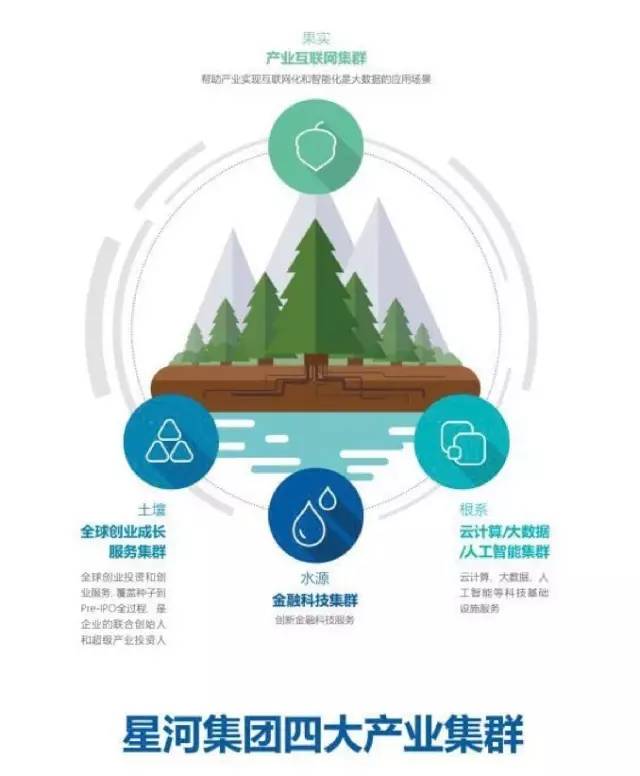 伴随业务拓展,星河集团形成了包括全球创业成长服务集群、云计算/大数据/人工智能集群、金融科技集群、产业互联网集群在内的四大业务集群,构成了一个既开放又协同的生态圈。