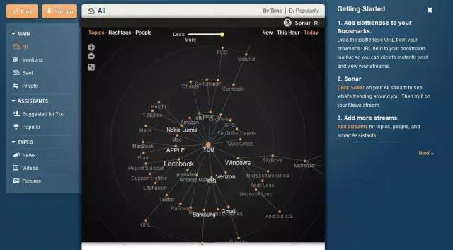 大数据可视化,则是建立在大数据分析之上的,让人们能够更加便捷的理解数据分析结果的手段。大多数提供数据可视化业务的公司都将其作为对数据分析的延伸业务,例如Bottlenose在进行数据分析自动化业务的同时,提供对社交媒体分析的“声纳图”,能够让用户对复杂的关系及逻辑线条一目了然,提升了用户对其数据分析业务的采纳程度。