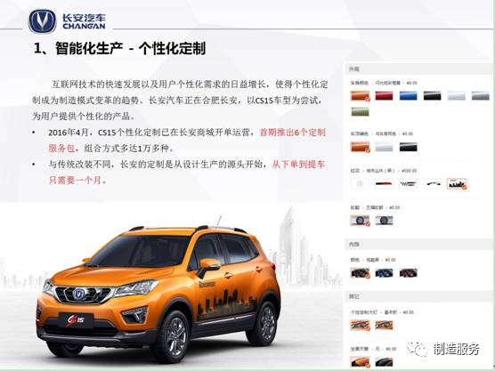 智能产品必须具备基于互联网和模块化设计思想,可以采用C2B模式的个性化定制,为客户提供产品的个性化定制。目前,在家具、服装等行业应用广泛,汽车行业也开展了一些尝试,如长安汽车在长安商城实现了CS15车型的个性化定制,定制参数包括颜色、外观装饰、内饰、发动机、天窗等。