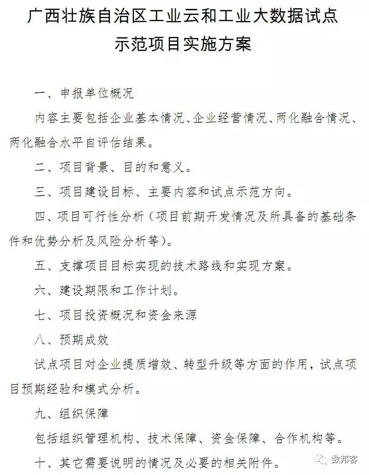 各市工业和信息化委员会: 根据《广西深化制造业与互联网融合发展实施方案》和《2017年主要工作措施分工安排》,为加快实施工业云和工业大数据试点示范建设,现就试点项目申报事宜通知如下: