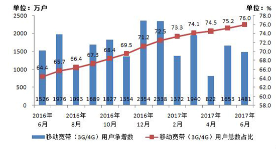 图3 2016-2017年6月移动宽带用户当月净增数和总数占比情况