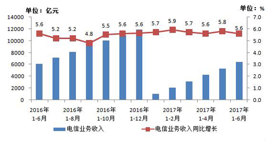 图1 2016-2017年6月电信业务收入发展情况
