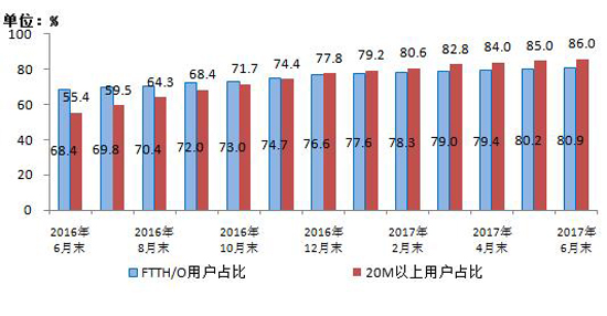 图4 2016-2017年6月光纤接入(FTTH/O)和20Mbps及以上