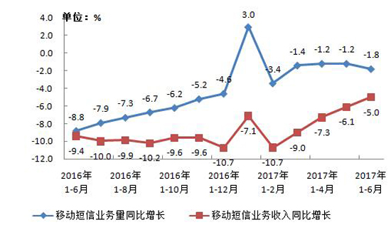 图7 2016-2017年6月移动短信业务量和收入同比增长情况