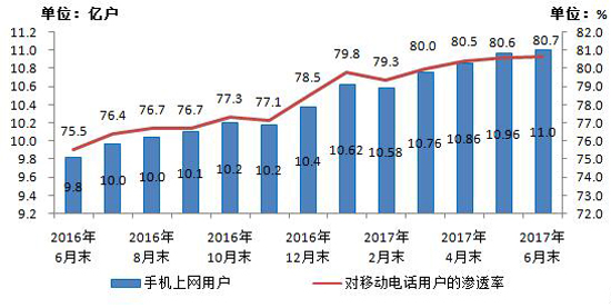 图5 2016-2017年6月手机上网用户和对移动电话用户渗透率情况