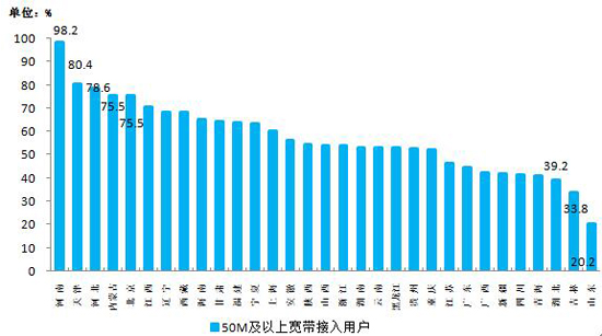 6月末,东、中、西部地区50M及以上宽带接入用户分别达到8470万户、5237万户和3747万户,用户渗透率中部地区领先,达到63%,东部、西部地区分别为51.7%和50%,各省间50M及以上宽带接入用户占比差异呈缩小态势,河南、天津、河北、内蒙古和北京分别居全国前五位,占比均超过四分之三。