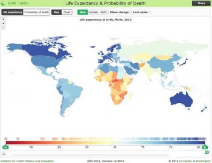 这个来自华盛顿大学关于卫生计量与评估(IHME)的项目阐述了188个国家在1990至2013年间生命期望和死亡率是如何改变的。