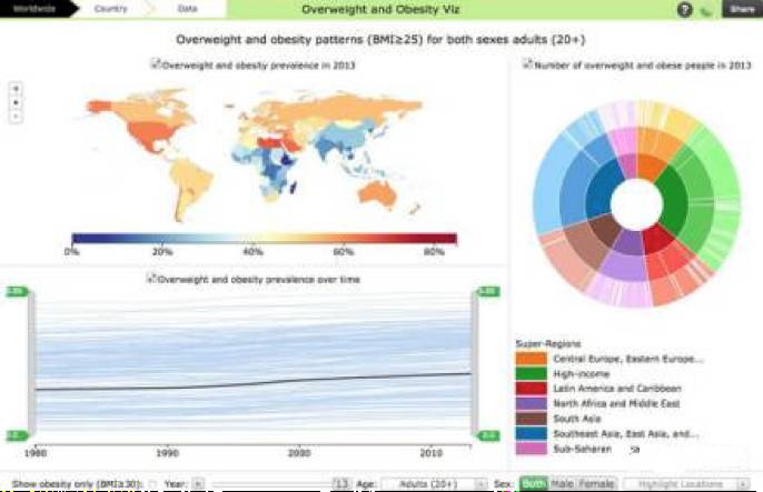 IHME于2014年5月发布了这个交互式图表,强调了全球性超重和肥胖问题在1980年至2013年之间出生的成年人的普遍性。数据来自大量的调查、报道和已发布的课题。