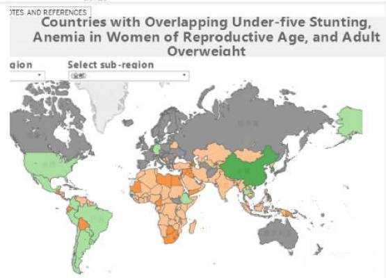 国际粮食政策研究所(IFPRI)于2014年11月发布了它的第一例年度全球营养报告,这是一个基于世界营养状况的综合分析。这个数据可视化方案使用了报道中的信息,阐述了全球普遍营养失调的一些类型。