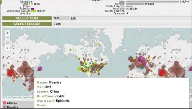由外交关系委员会的全球健康项目制作的这个数据可视化方案,绘制了全球麻疹、腮腺炎、百日咳、小儿麻痹症、风疹以及其他可预防的疾病的爆发情况。