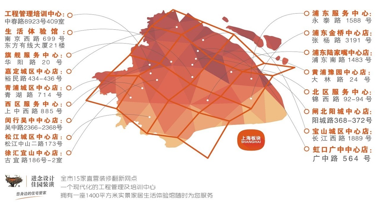 佳园装潢23年创业服务足迹已经遍布上海各个角落,15家直营门店,一座现代化的工程及饰服管理中心,同时拥有一家1400平米的实景家居生活体验馆为沪上市民服务。公司长期致力于打造符合现代服务特点的企业文化,打造以人为本的“舒适家”品牌战略,打造打造紧跟时代步伐的信息化管理模式。总之,探索,发展,再探索再发展是我们做100年的理由,是我们成为您身边的住宅管家的动力,我们将一步一个脚印奋力前行。
