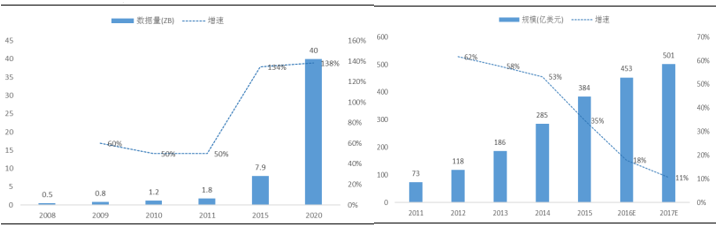 在互联网及智能硬件快速普及的当下,数据以爆炸方式增长。据Forrester的研究结果,目前在线或移动金融交易、社交媒体、GPS坐标等数据源每天要产生超过2.5 EB(1EB=1024*1024TB)的海量数据。据IDC预计,全球数据总量增长率将维持50%左右,2020年全球数据总量将达到40ZB;中国将达到8.6ZB,占全球的21%。根据中国信息产业研究院的数据显示,2015年中国大数据市场规模约为116亿元,同比增长38%;预计未来几年,随着应用效果的逐步显现,中国大数据市场规模还将维持40%左右的高增长。
