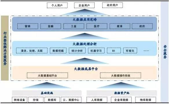 大数据产业链底层由基础设施与数据资产池构成,其上构建大数据分析与操作平台。在数据处理分析基础上,挖掘各个垂直行业应用,最终为用户提供服务。