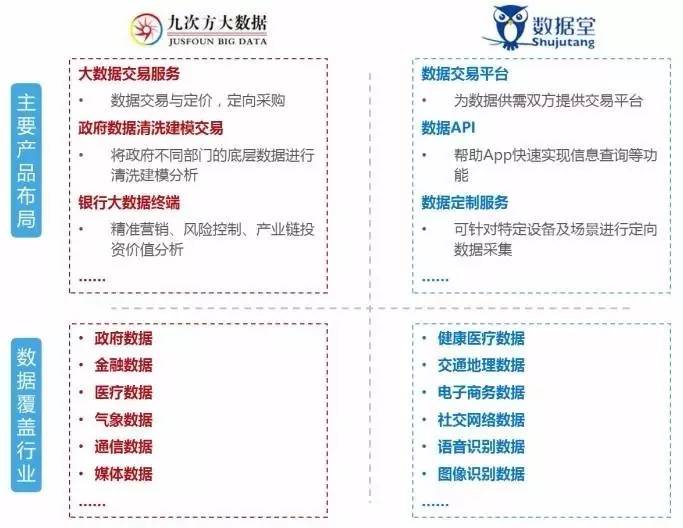 数据堂提供计算机、医疗、交通、电商等多行业数据的交易服务。而九次方大数据则主要提供政府数据、国家部委数据及金融等种类的数据。