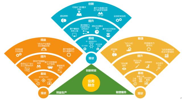 一是创新研发。针对飞机研发设计单位,围绕智能化飞机研发创新,进行业务优化并匹配技术体系建设,逐步提升创新能力。在基础能力方面,构建数字化设计、单一数据源及构型管理、研发质量管理等能力 ;在能力提升方面,构建基于模型的系统工程、多专业综合设计、集成仿真验证等 ;在创新能力方面,在前面两个阶段能力建设的基础上,实现虚实映射、基于大数据分析的飞机研发创新,并支持飞机的全球研发协同。