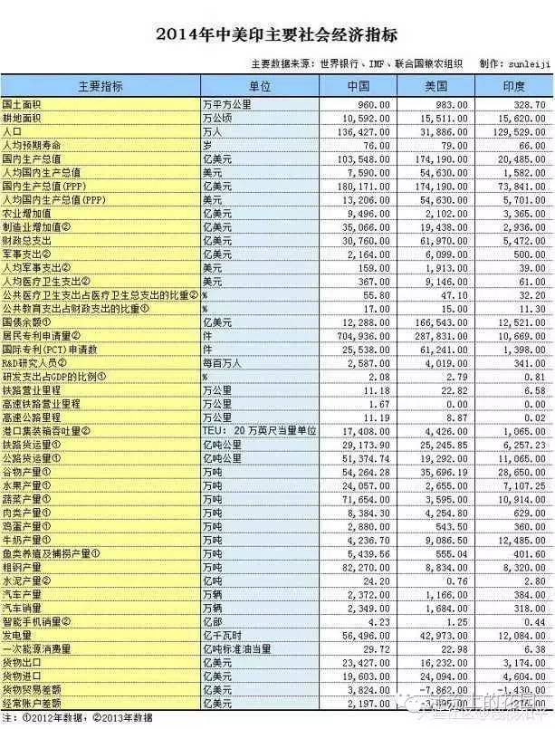 再上一张2014年中美印的主要社会经济指标图(部分为12,13年数据)