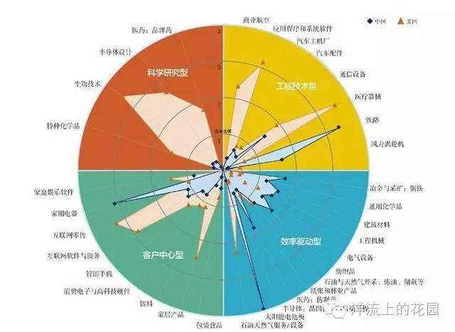 上图是中国和美国在33个工业领域的科技实力雷达图,目前,中国在家用电器、建材、铁路和高铁技术、风力涡轮机和电力设备、太阳能电池板和石油天然气设备等领域领先于美国,但其他20多项技术领域都差于美国,在商业航空器、半导体、生物机器、特种化工和系统软件等技术领域,和美国的差距在 20至30年左右。