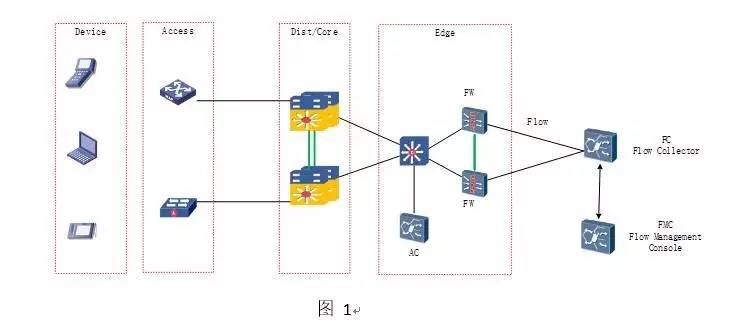 在企业网中,最令网络管理员头疼的就是更改网络拓扑或者更改大量的网络配置,一来实施量大,二来更改配置会有影响现网业务正常运行的风险。而可视化网络的部署,无需改变现网的主干结构,只需所有的网络设备开启Netflow,NetStrem ,SFlow、Jflow 等其它标准的Flow 协议,对于不支持Flow的设备,则可以通过SPAN 进行端口镜像,把流量导进FC即可。基本所有的企业网网络设备都支持这些功能。对于网络可视化的组建FC(Flow Collector) 和 FMC (Flow Management Console) 只要为其配置可用的IP即可。