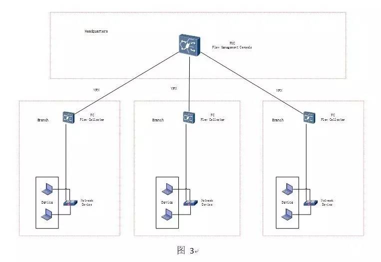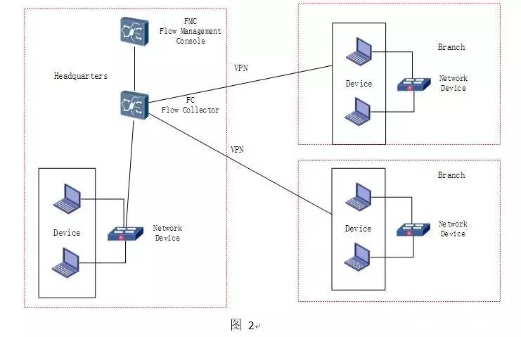 集中部署:当企业有多个分支机构时,所有分支机构的网络设备只要开启NetFlow 或者 类似的 Flow 功能即可,然后指向总部的FC即可。只有企业总部有网络可视化设备FC 和 FMC 。对于FC 和 FMC 只要配置可用的IP即可。如图2: