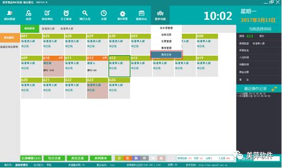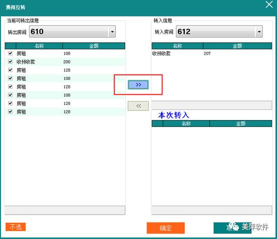美萍酒店ERP支持两个在住房间之间费用互转,在前台营业里选择更多功能-费用互转: