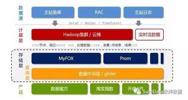 淘宝大数据如上图所示,淘宝的海量数据产品技术架构分为五个层次,从上至下来看它们分别是:数据源,计算层,存储层,查询层和产品层。