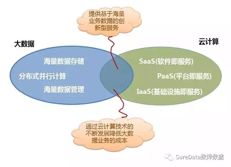 业内是这么形容两者的关系:没有大数据的信息积淀,则云计算的计算能力再强大,也难以找到用武之地;没有云计算的处理能力,则大数据的信息积淀再丰富,也终究只是镜花水月。