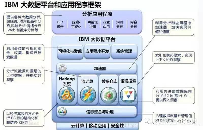 以IBM举例,上一个十年,他们抛弃了PC,成功转向了软件和服务,而这次将远离服务与咨询,更多地专注于因大数据分析软件而带来的全新业务增长点。IBM执行总裁罗睿兰认为,“数据将成为一切行业当中决定胜负的根本因素,最终数据将成为人类至关重要的自然资源。”IBM积极的提出了“大数据平台”架构。该平台的四大核心能力包括Hadoop系统、流计算(StreamComputing)、数据仓库(Data Warehouse)和信息整合与治理(Information Integration and Governance)